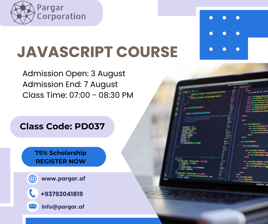 Course Details Time: 07:00 – 08:30 PM Course Code: PD037 Schedule: Saturday, Monday, Wednesday Class Fee: 75% Scholarship | 550 AFs. Course Timeline Admission Open: August 3rd Admission End: August 7th Course Overview This JavaScript course helps you become familiar with the fundamentals of web programming. In this course, you will learn key […]